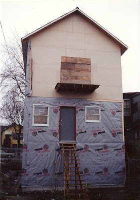 | Once the housewrap was up, I was installing the windows. The two pieces of plywood on the 2nd floor are covering the opening for the front door. |